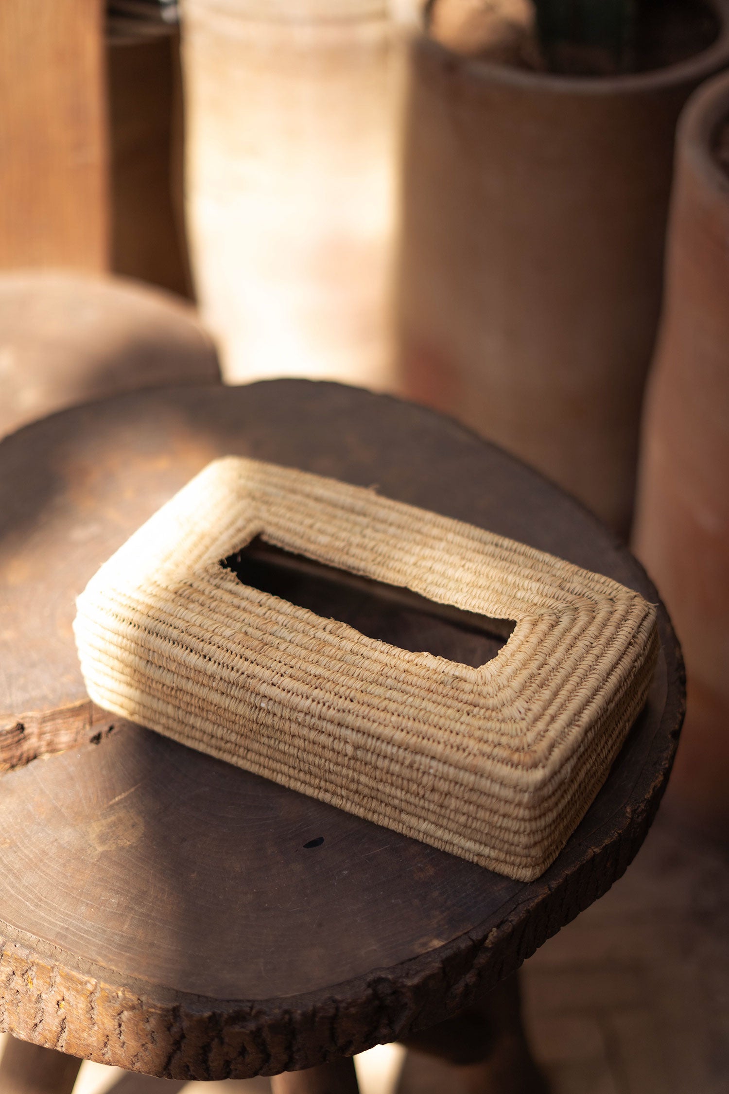 Cache-mouchoirs en raphia tressé — simplicité naturelle et lignes épurées pour une touche d’élégance artisanale au quotidien.