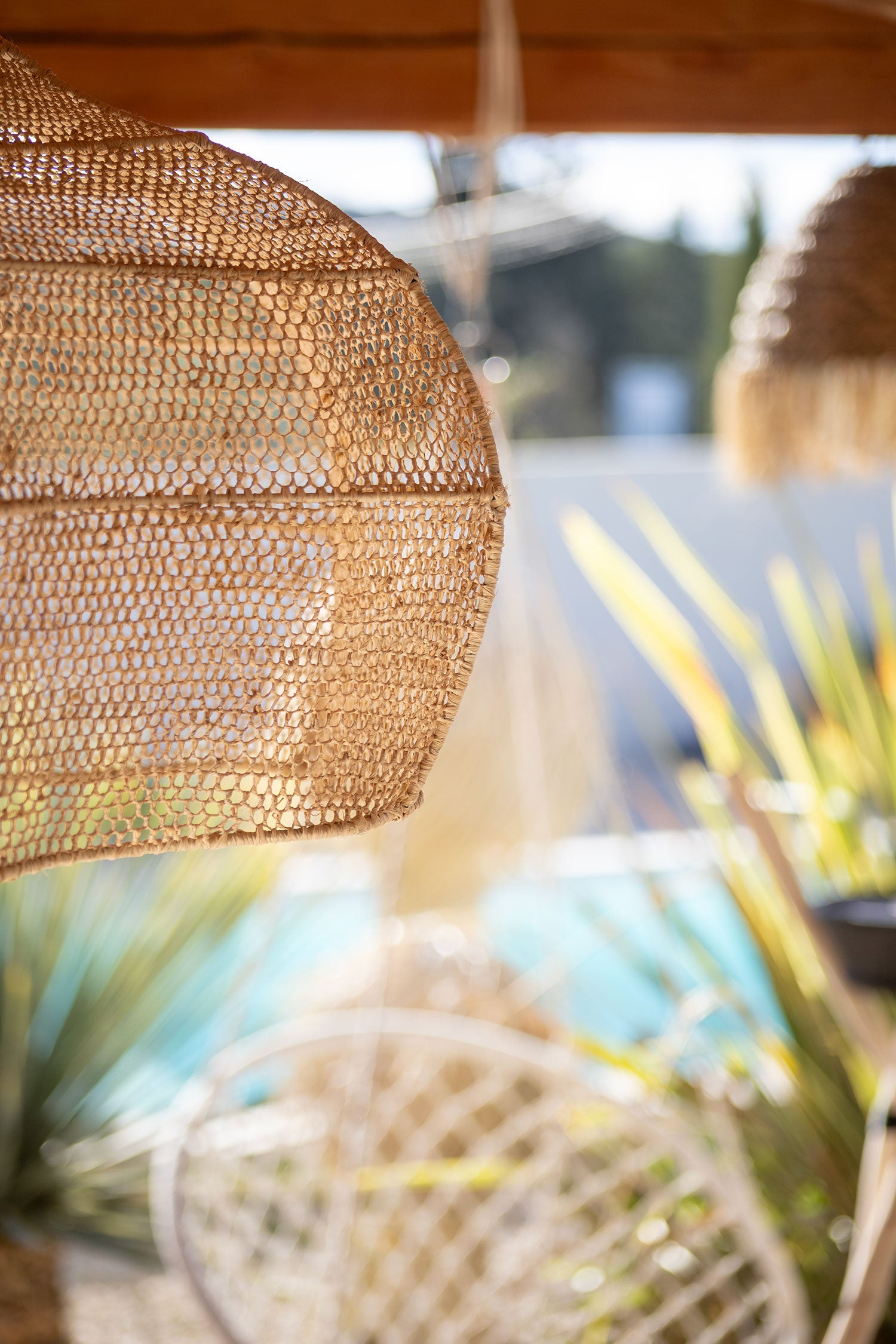 Suspension en raphia tressé. Lumière naturelle, forme organique — l’élégance suspendue.