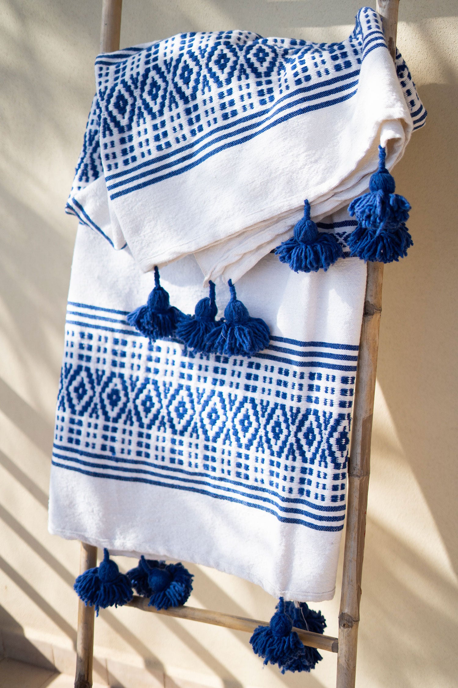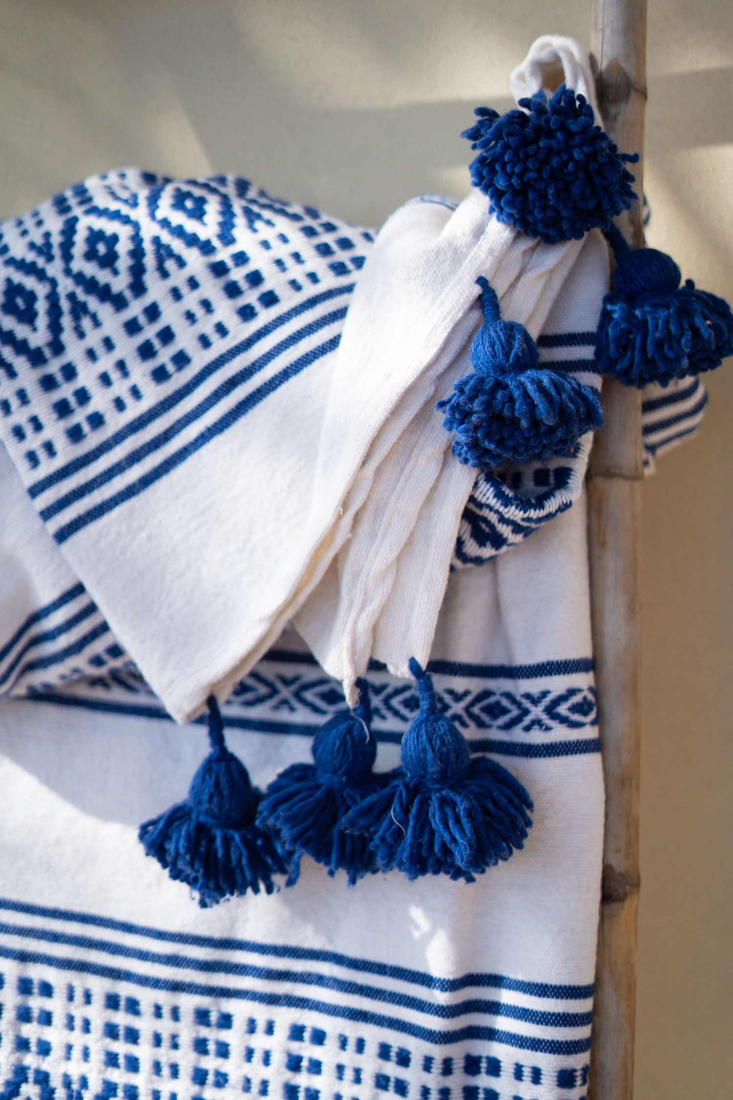 Pièce artisanale en coton, tissée à la main avec finitions pompons.