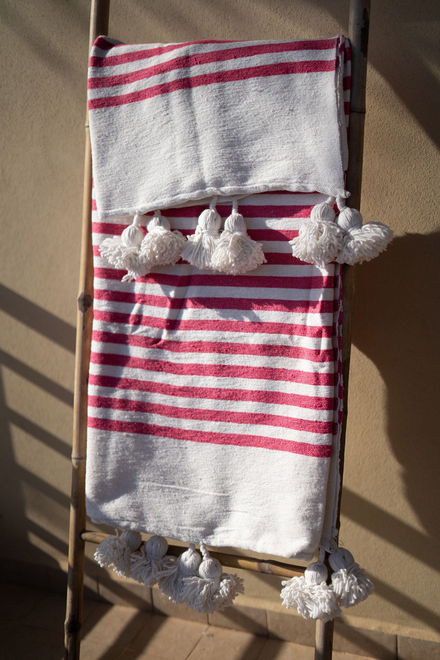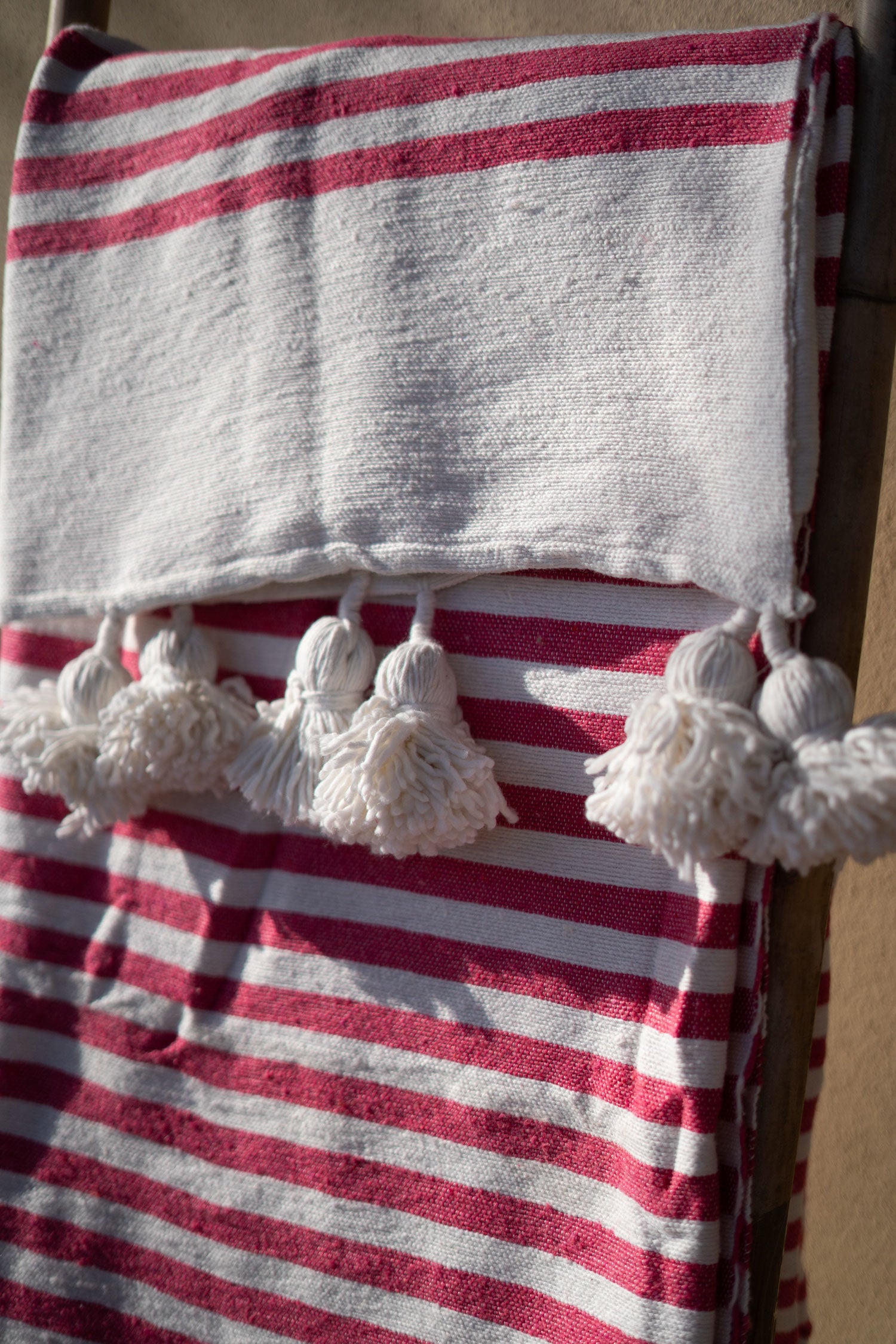 Pièce artisanale en coton, tissée à la main avec finitions pompons.