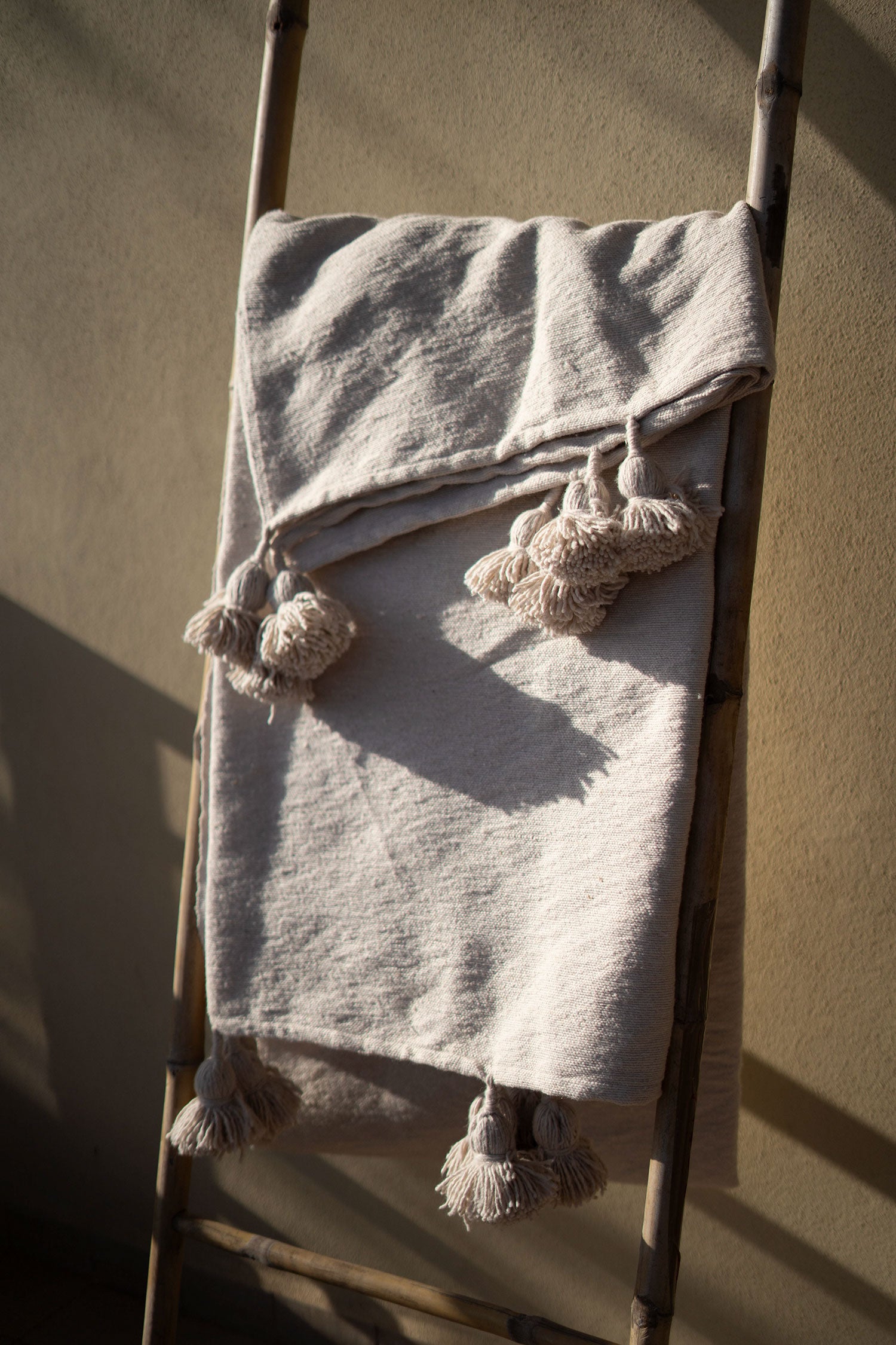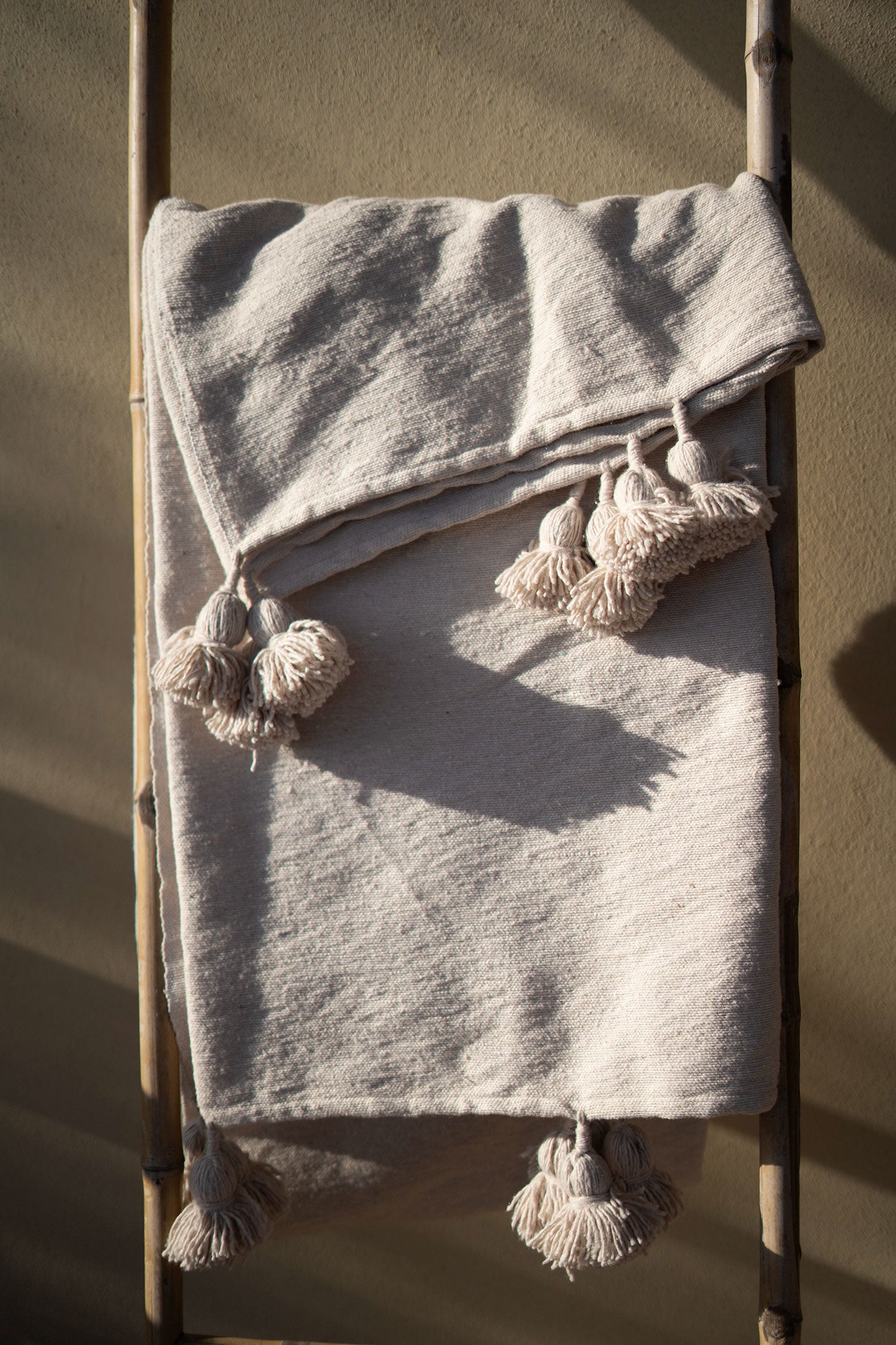 Pièce artisanale en coton, tissée à la main avec finitions pompons.
