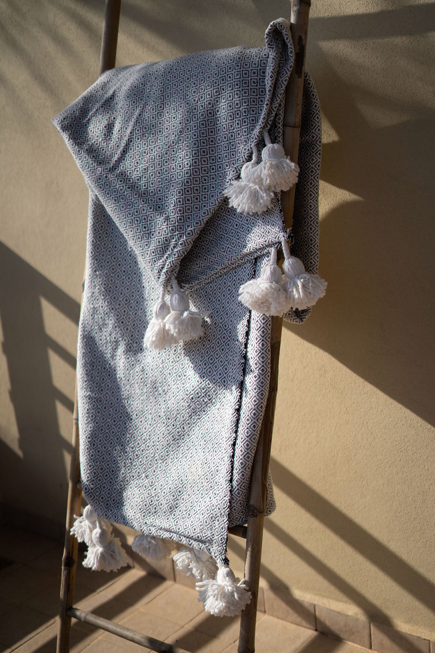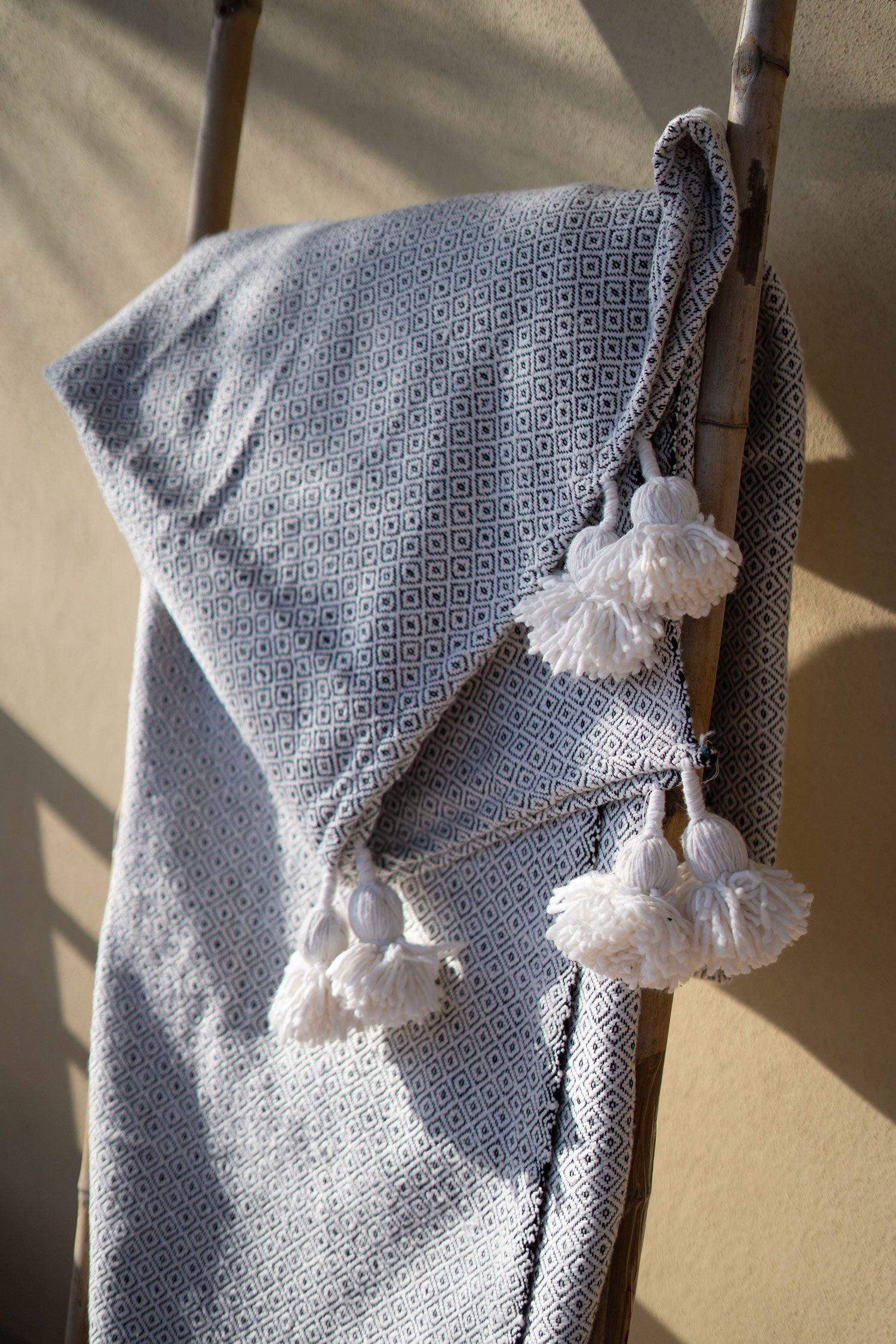 Pièce artisanale en coton, tissée à la main avec finitions pompons.