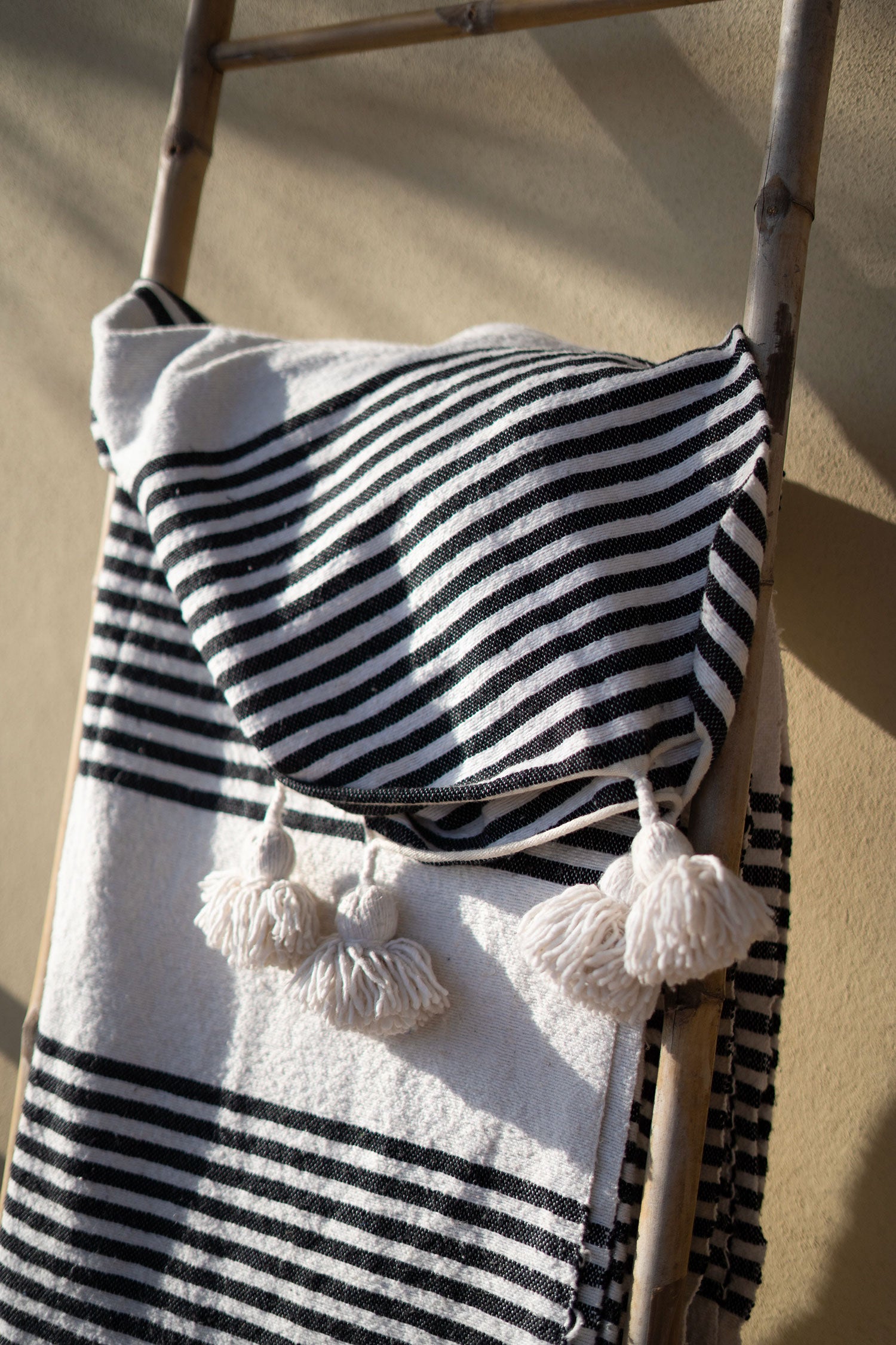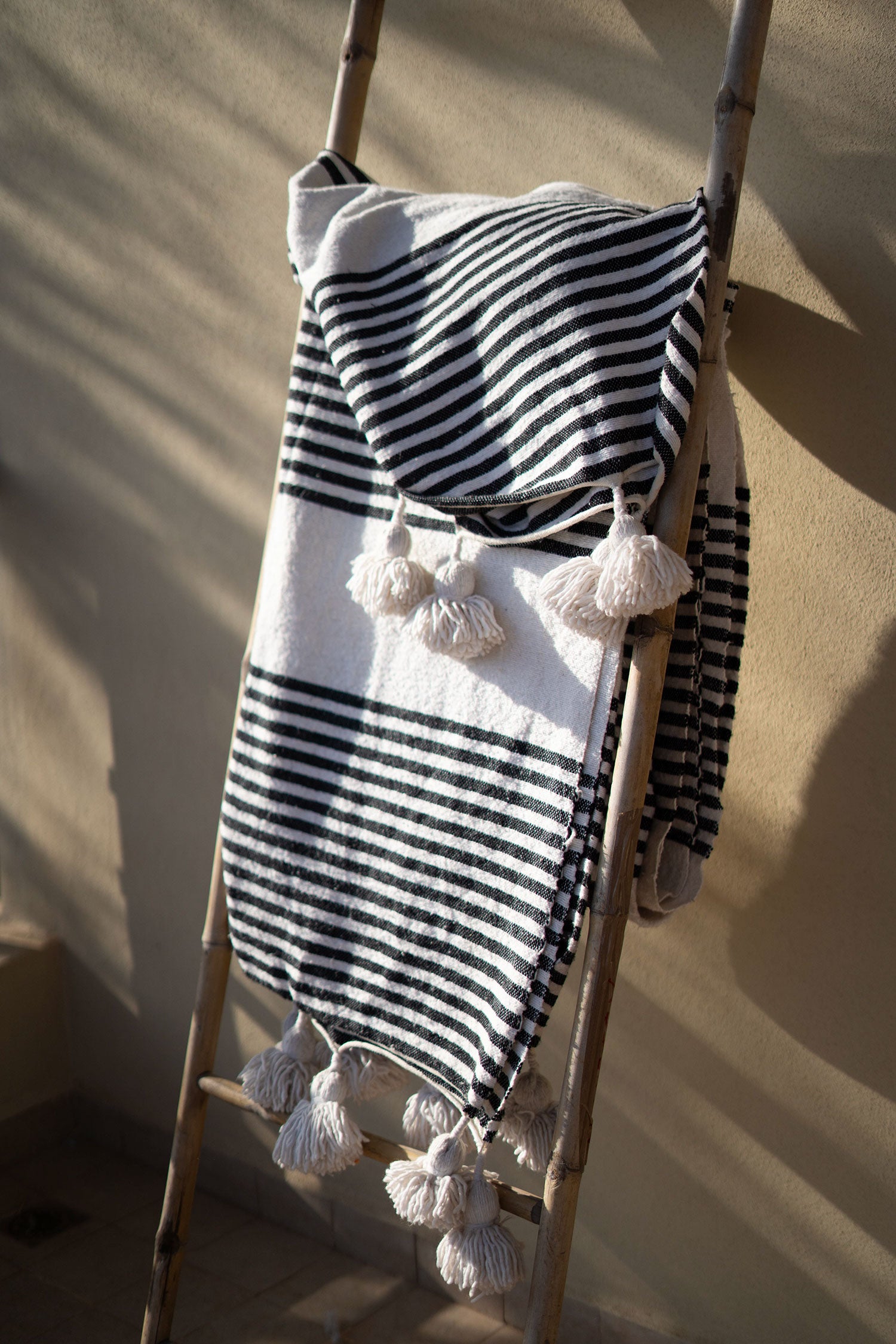 Pièce artisanale en coton, tissée à la main avec finitions pompons.