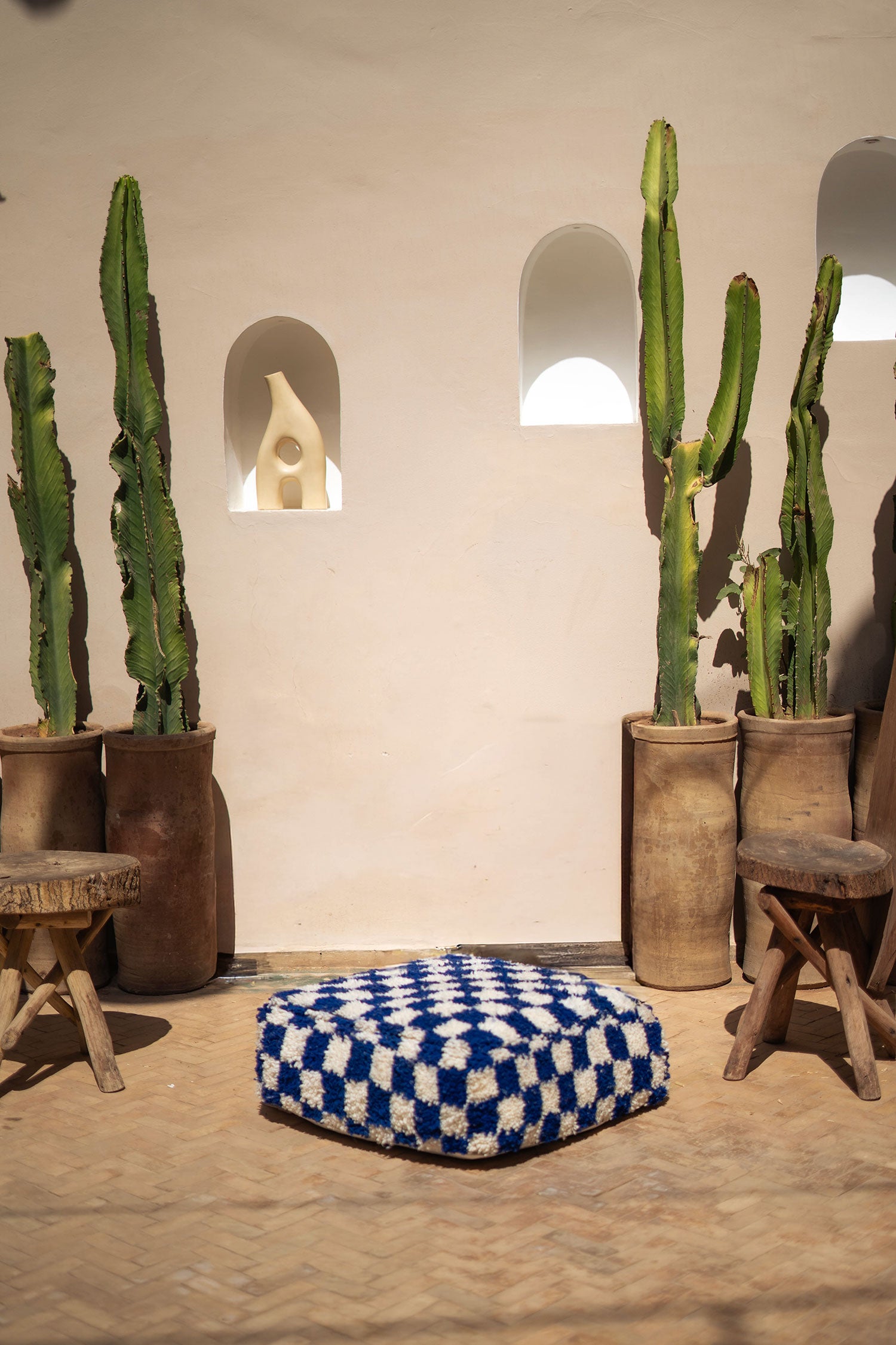 Couleurs bleu Klein et écru — touche artisanale et graphique.