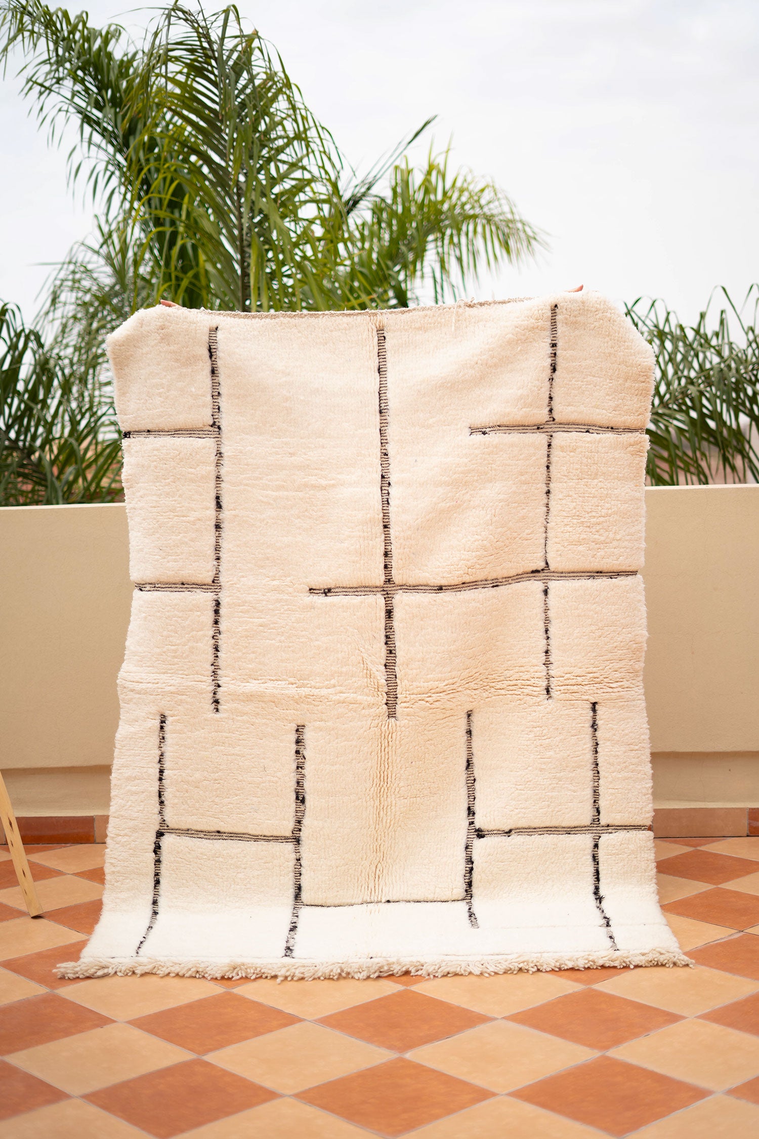 Tapis berbère écru aux lignes noires épurées. Un design graphique et intemporel qui s’intègre avec élégance dans les intérieurs modernes et minimalistes.