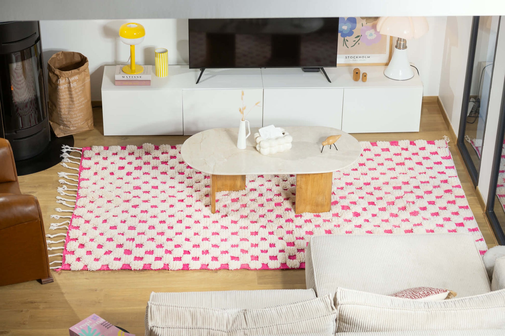 Tapis berbère écru et rose fuchsia à motifs géométriques. Tissé à la main, il insuffle une touche vive et joyeuse à votre intérieur tout en restant élégant.