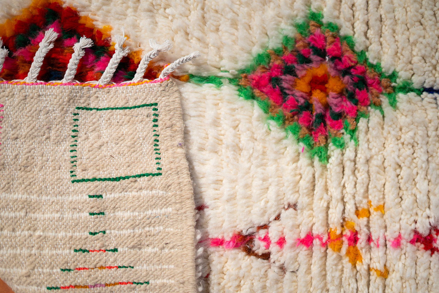 Tapis berbère à losanges colorés sur fond écru. Ses motifs vifs et joyeux symbolisent la vitalité de l’artisanat marocain et apportent chaleur et énergie à votre intérieur.
