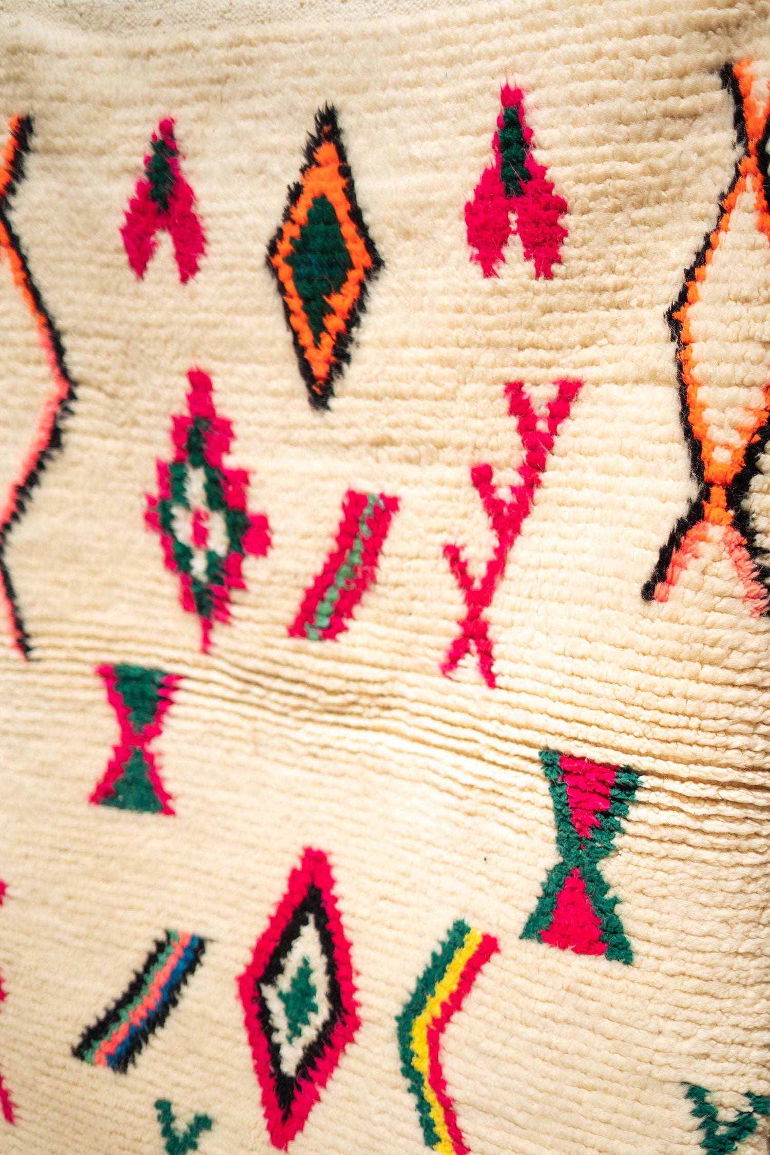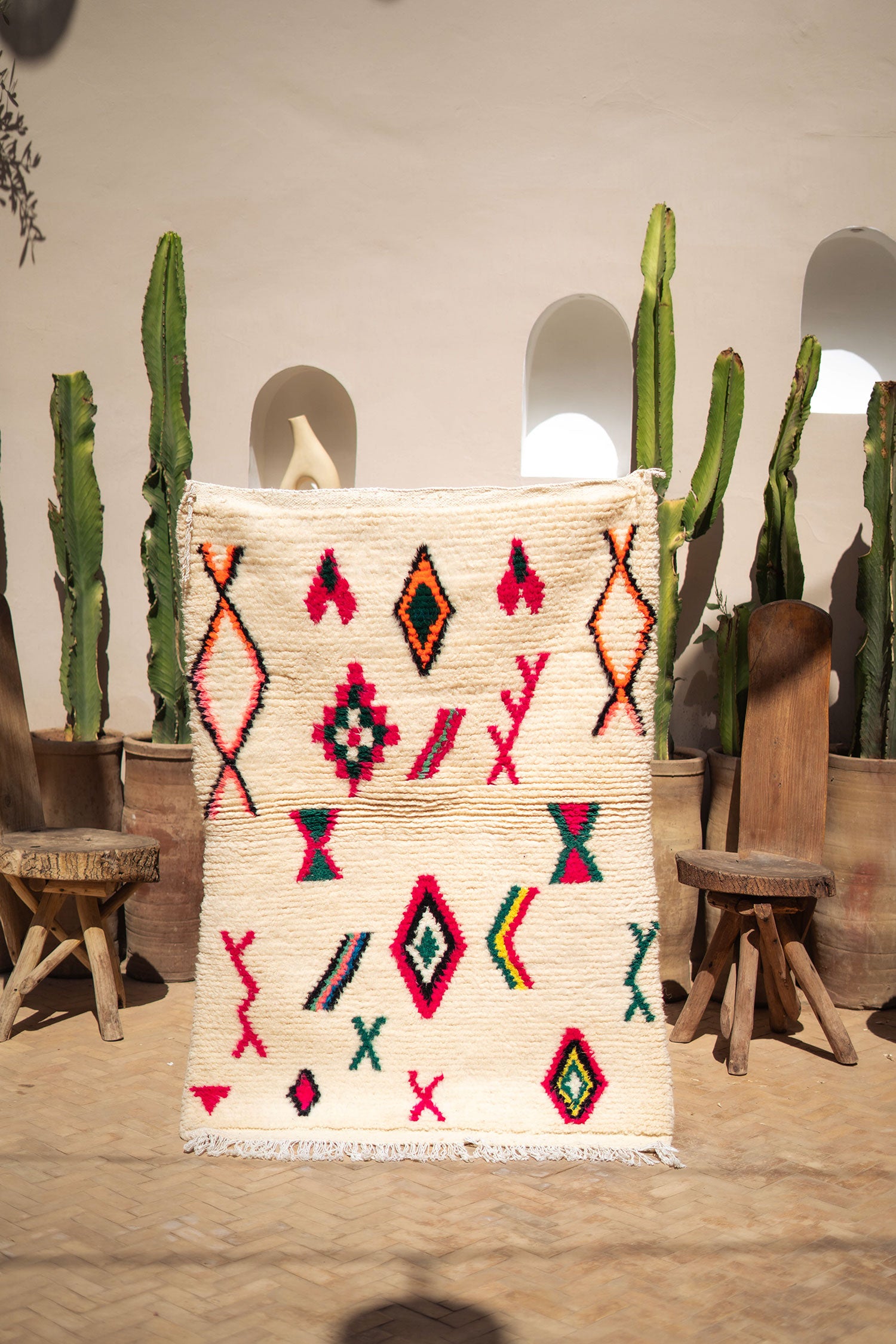 Tapis berbère aux motifs berbères colorés sur fond écru. Entre modernité et tradition, ses formes géométriques vives insufflent une note artisanale et chaleureuse à votre intérieur.