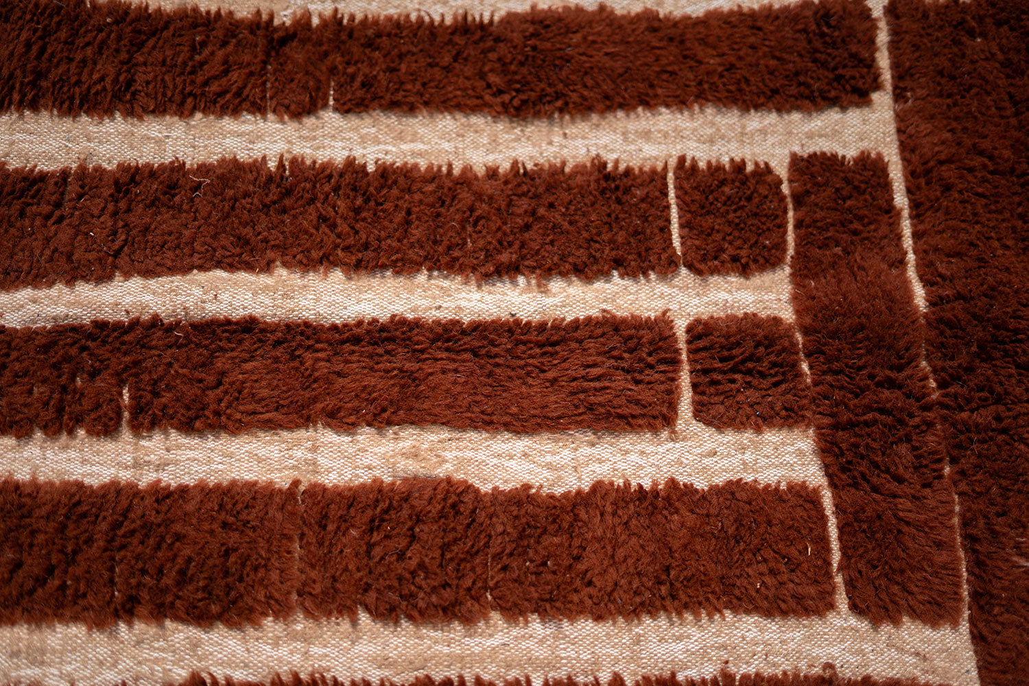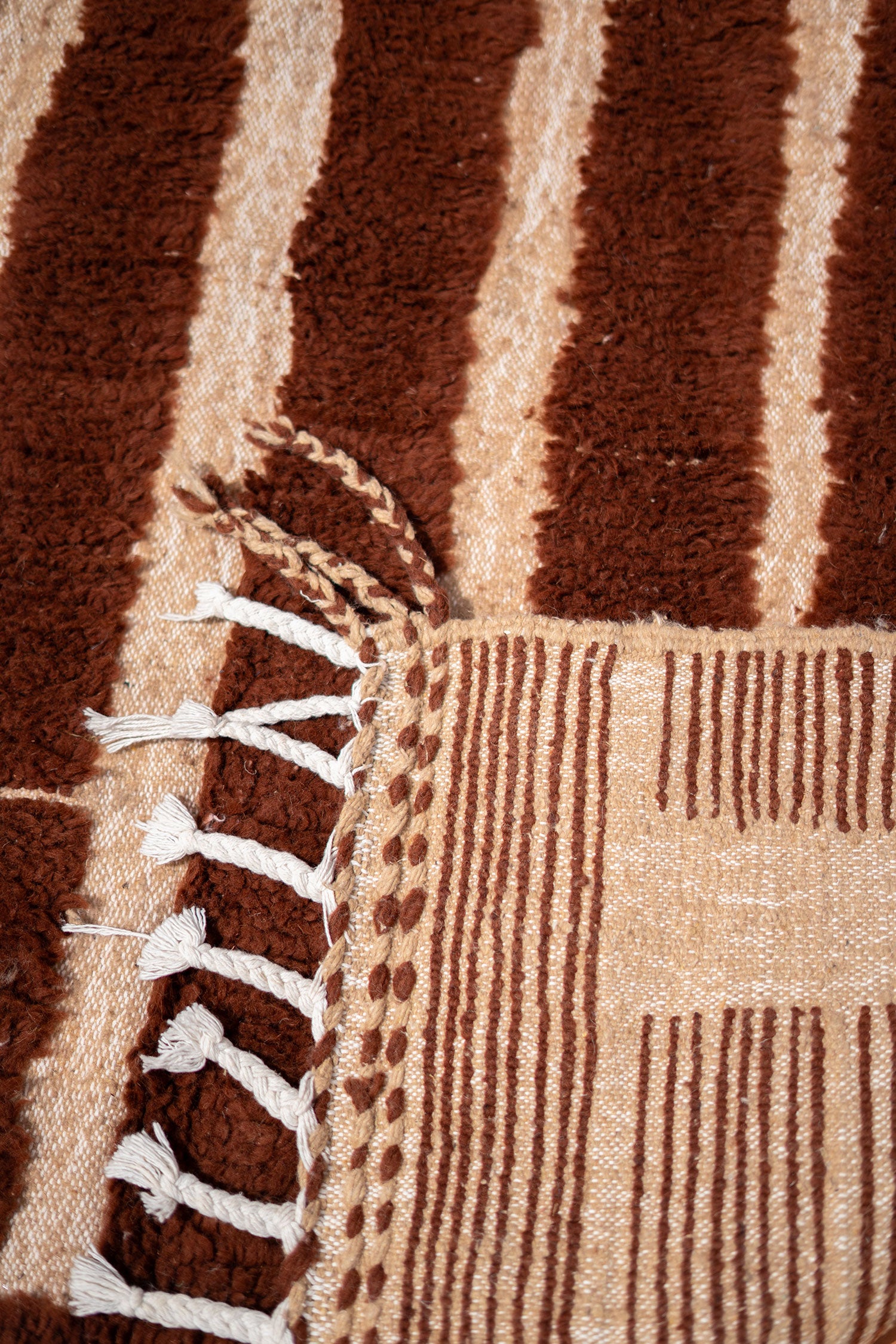 Tapis berbère marron terre et écru à rayures verticales. Sobre et chaleureux, il apporte une touche naturelle et contemporaine à votre décoration.