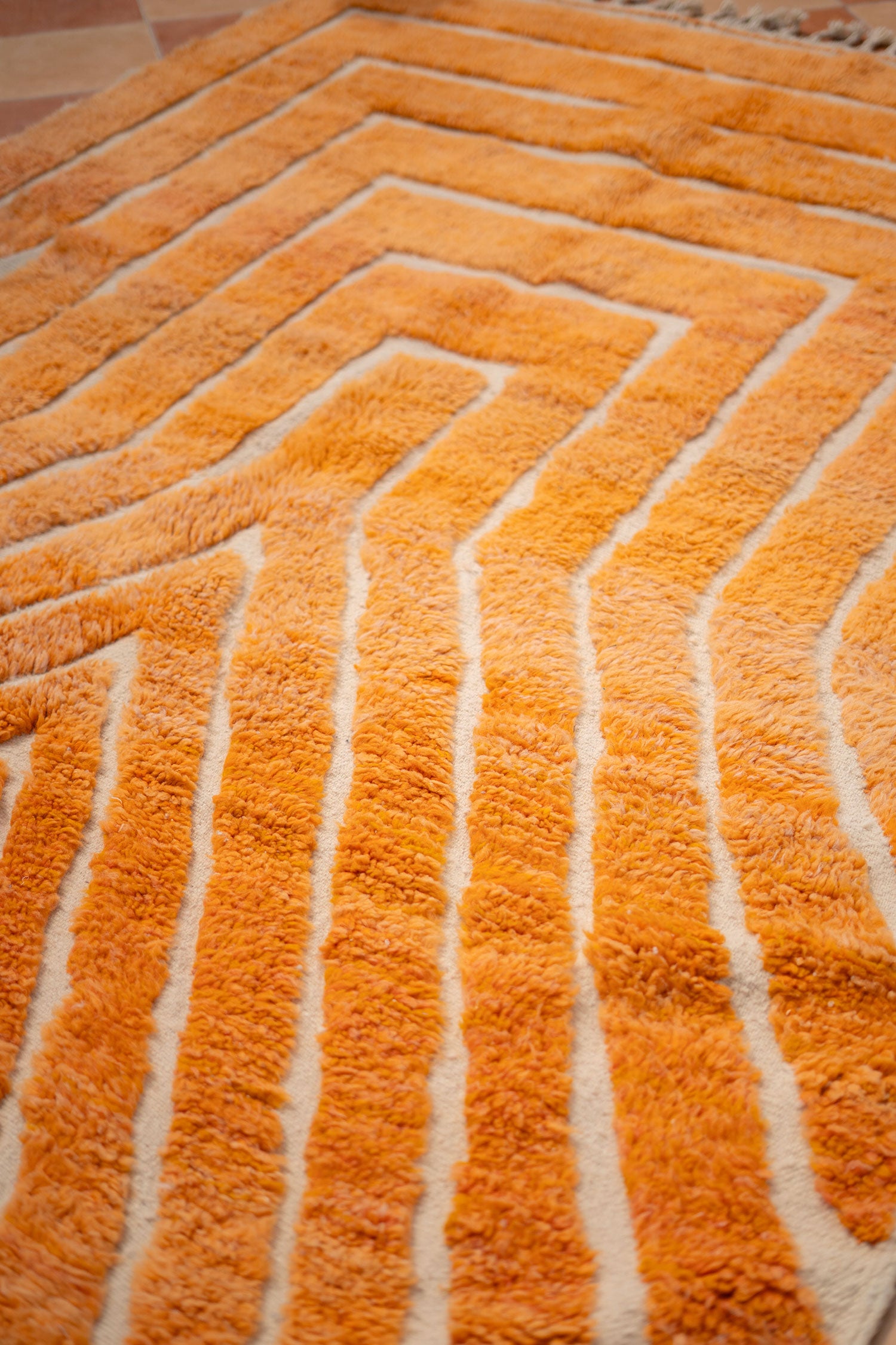 Tapis berbère orange aux lignes concentriques écrues. Moderne et solaire, il apporte énergie et luminosité à tout espace de vie.