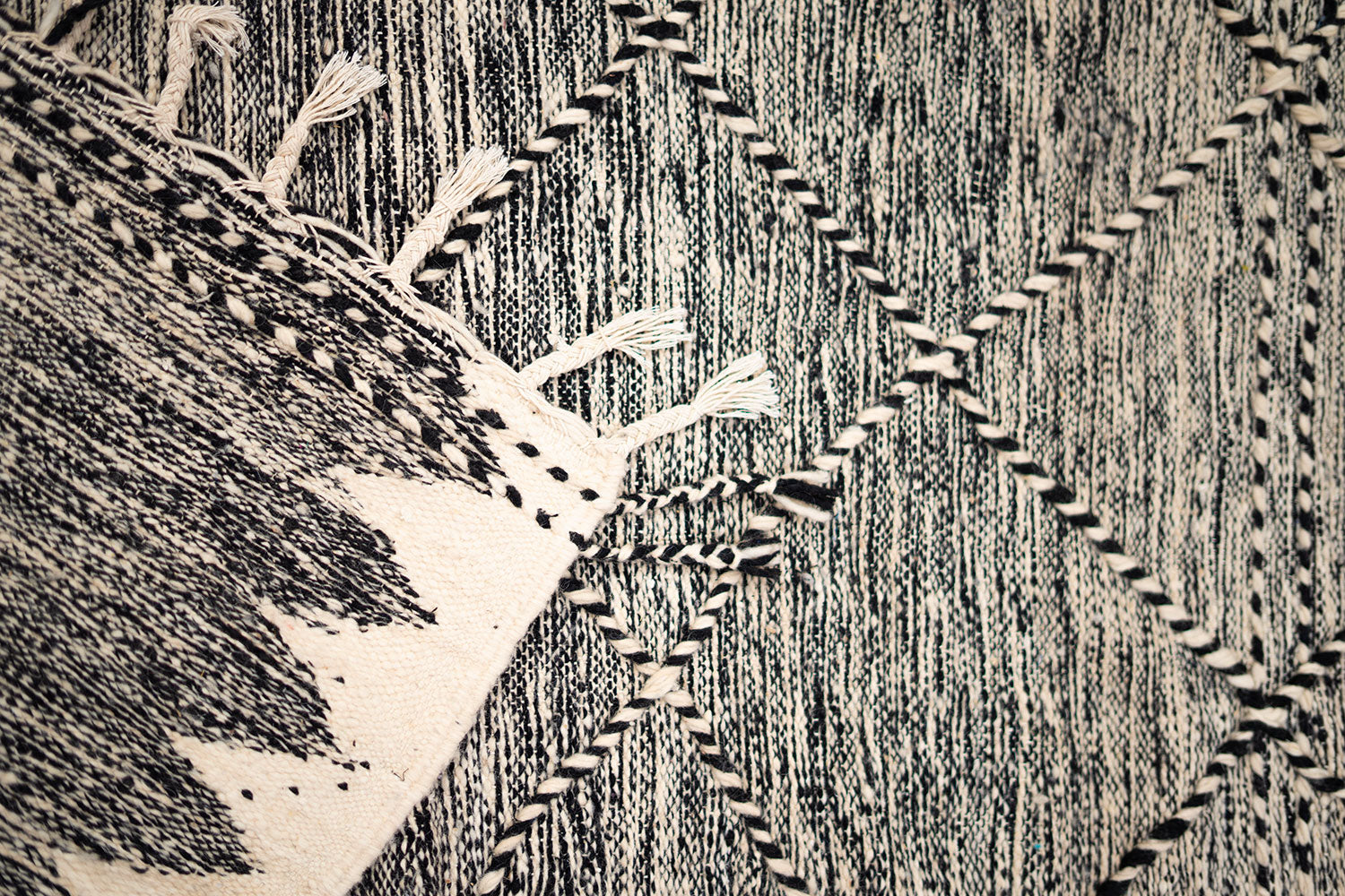 Tapis couloir berbère en laine écrue et noire, aux motifs losanges tressés. Élégant et graphique, il apporte une touche artisanale raffinée à vos passages et entrées.
