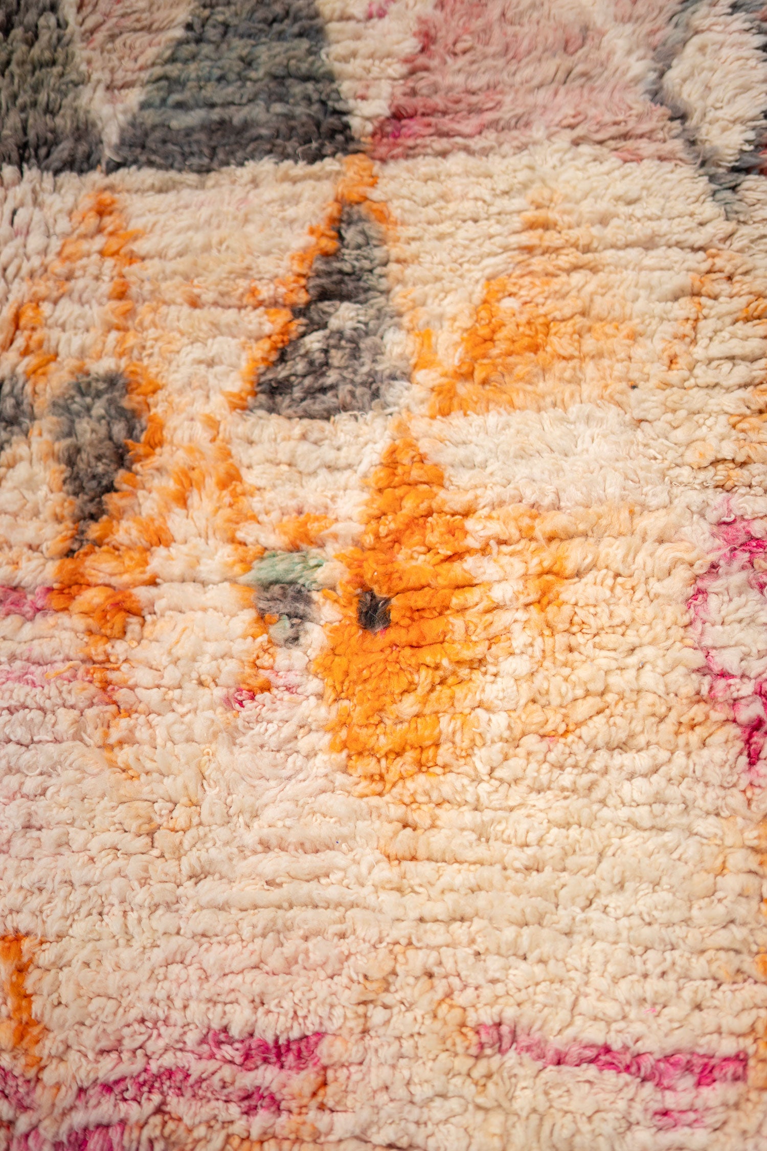 Tapis berbère aux motifs losanges dans des tons doux de rose, orange et noir. Pièce artisanale chaleureuse et lumineuse, idéale pour un intérieur bohème et raffiné.